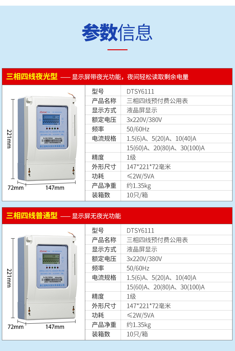 (四)三相預(yù)付費(fèi)電度表(公用表)的參數(shù)信息:產(chǎn)品名稱、顯示方式、額定電流、頻率、電流規(guī)格、精度、外形尺寸、功耗、產(chǎn)品重量,裝箱數(shù)等信息,具體如下