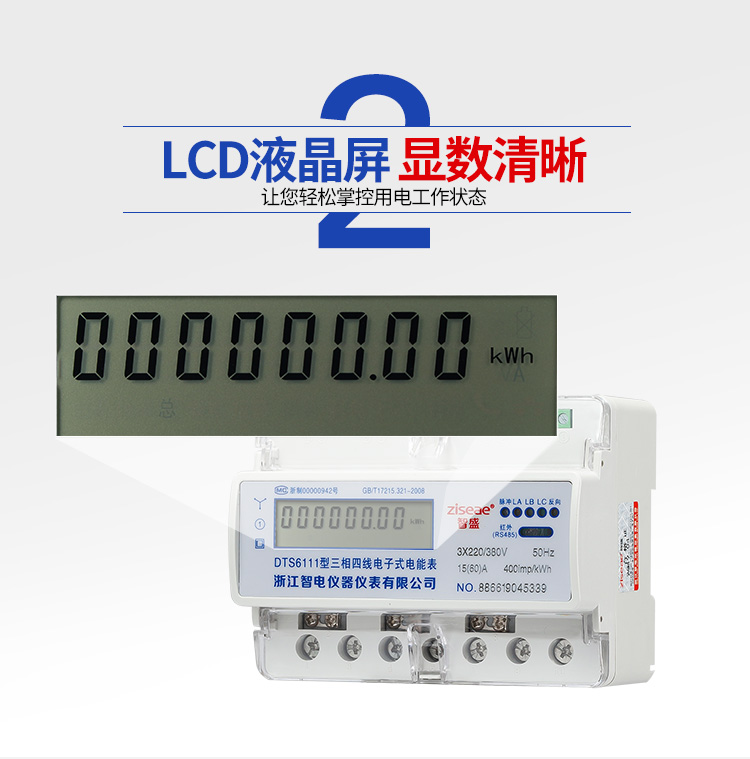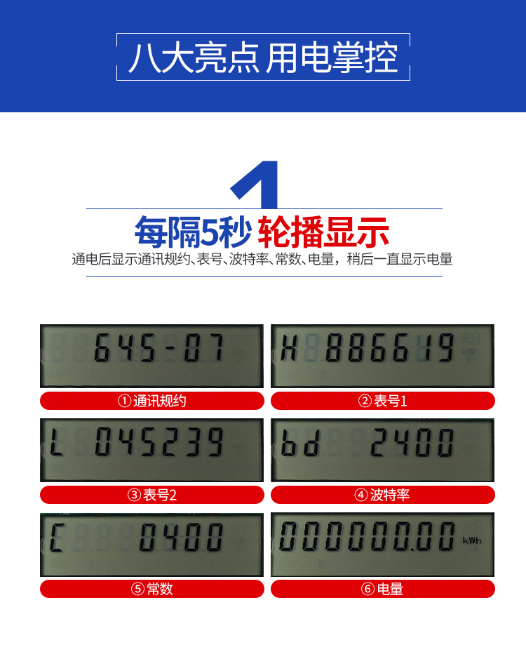 5.顯示功能 :采用寬溫大液晶方式顯示各類信息;電能量顯示位數(shù)為6為整數(shù),2為小數(shù),具有參數(shù)自動輪顯功能。